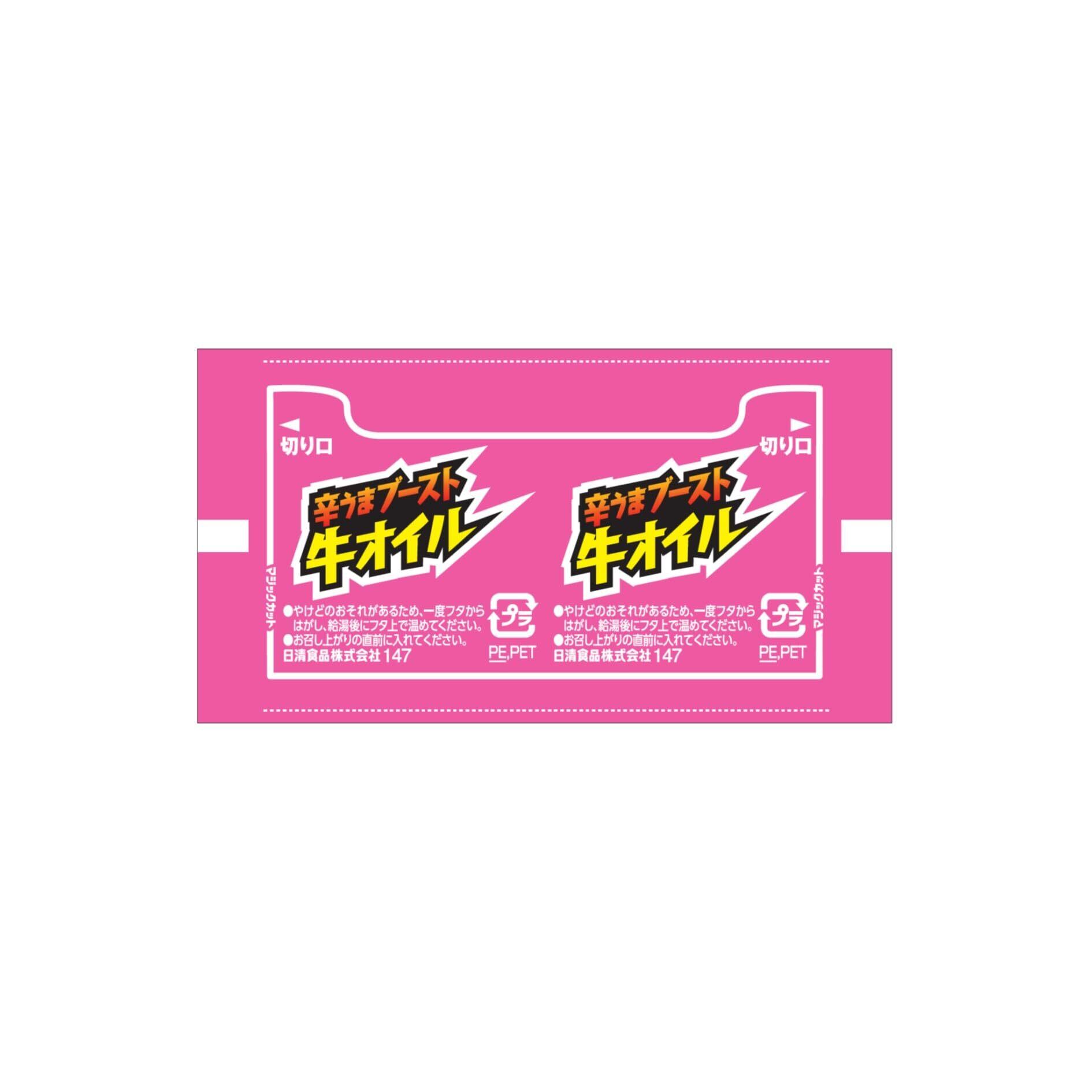 【1】フタの上の辛うまブースト牛オイルの袋を取り、フタを↓まではがす。【2】熱湯を内側の線までゆっくりと、まんべんなく注ぐ。【3】辛うまブースト牛オイルをフタの上で温めながら5分待つ。【4】フタをはがし、辛うまブースト牛オイルを入れ、よくかきまぜてできあがり。