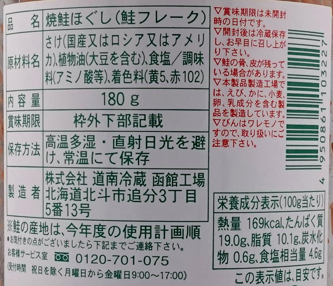 鮭(国産)、植物油(大豆を含む)、食塩、調味料(アミノ酸等)、着色料(黄5、赤102)