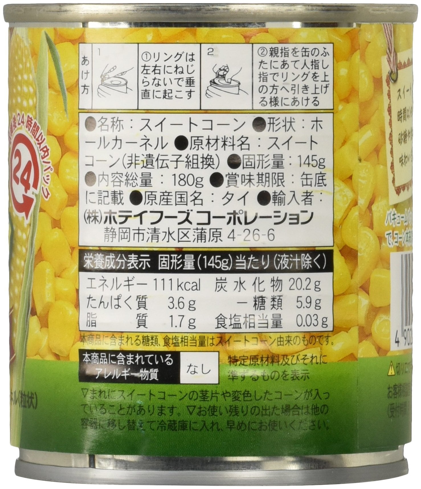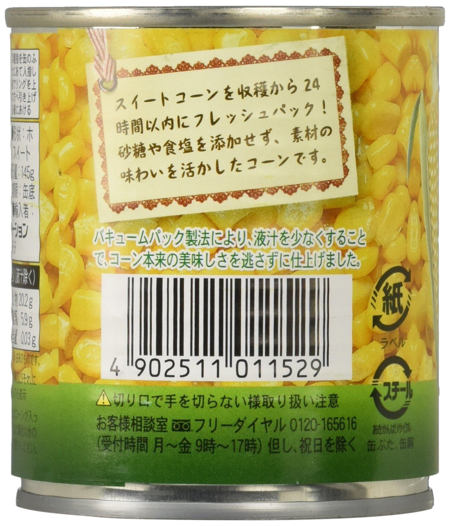 食品添加物はもちろんのこと、砂糖や食塩を使用しておりません。色鮮やかで甘味に優れたスーパースイート種のコーンを収穫から24時間以内にフレッシュパックしました。非遺伝子組換原料のみを使用しています。バキュームパック製法で液汁を少なくすることにより、コーン本来の美味しさを逃さず製造しました。缶切り不要の手軽に使えるイージーオープン缶です。