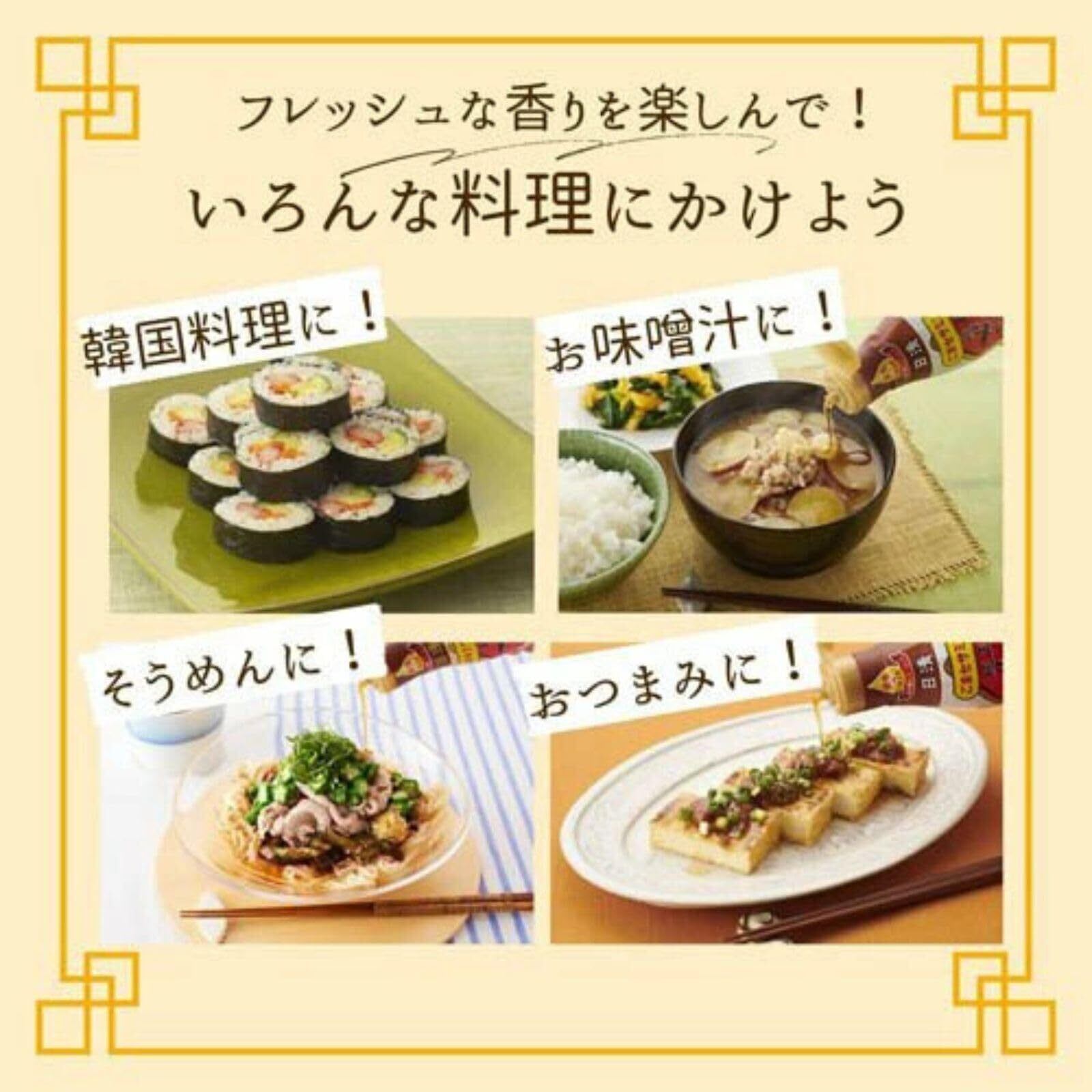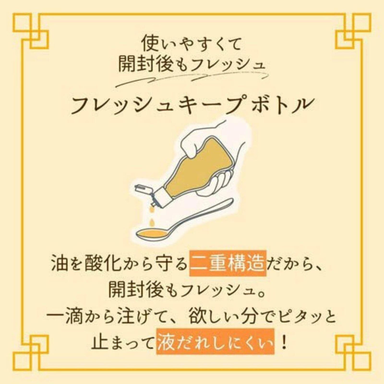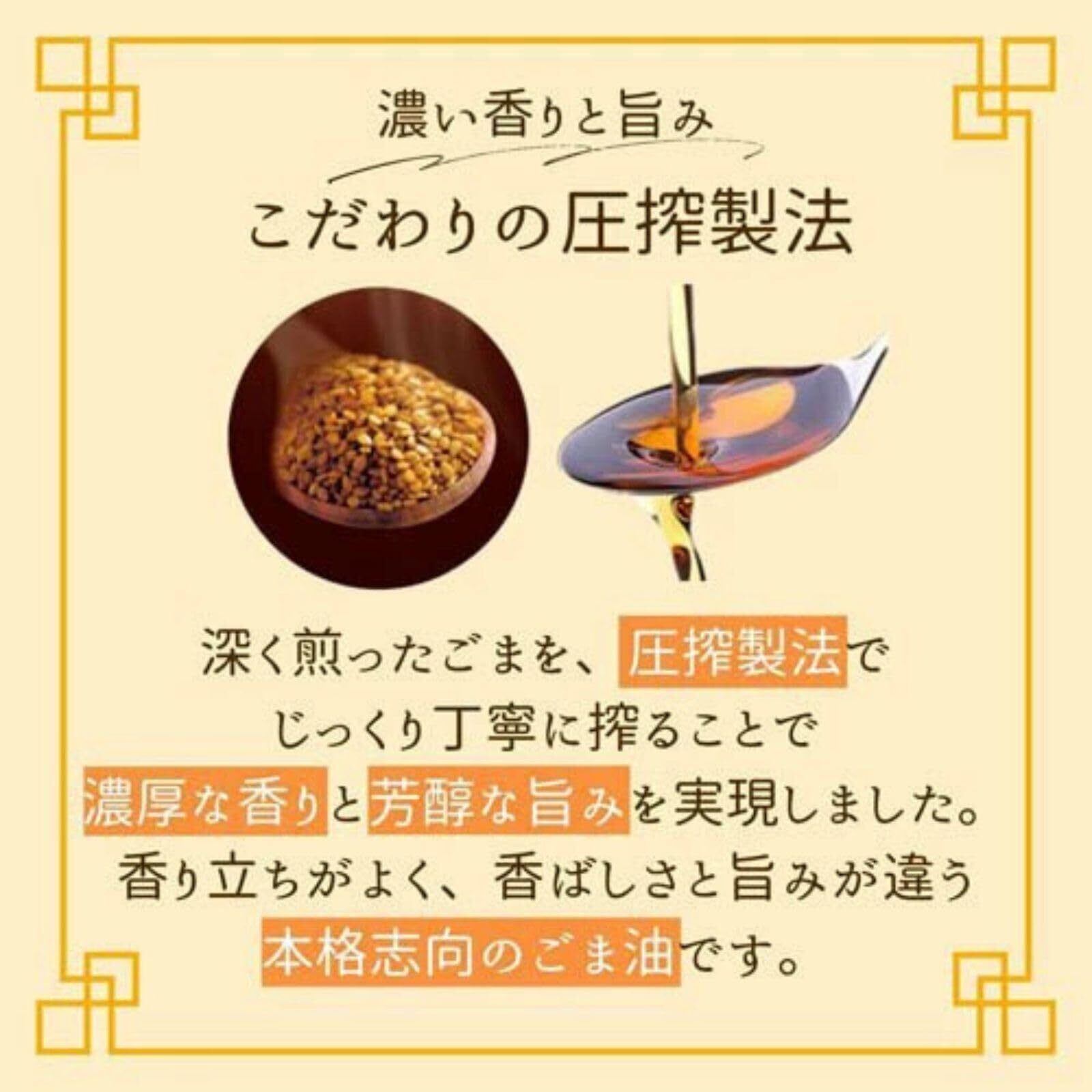 深く煎ったごまを圧搾製法でじっくり丁寧に搾ることで、濃厚な香りと豊醇な旨みを実現しました。香り立ちが良く、香ばしさと旨みが違う本格志向のごま油です。またオイルを酸化から防ぐフレッシュキープボトルだから開封後もフレッシュ。一滴から注げて、液ダレしにくいので、卓上で使いやすいです。