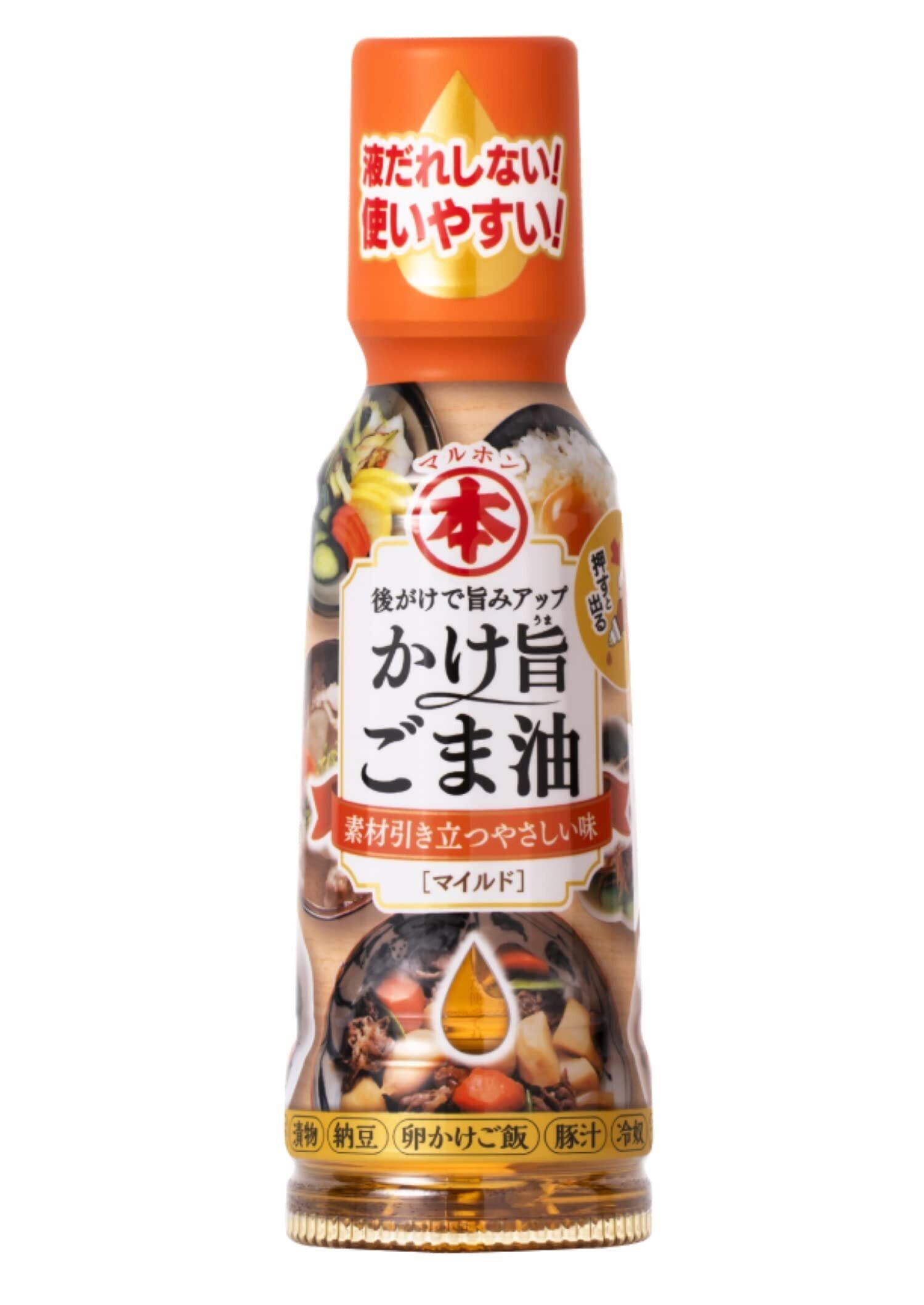 「かけ旨ごま油 マイルド」は厳選したゴマを浅く焙煎し、ごま油特有の香味・風味をおだやかに引き出したごま油です。澄んだ琥珀色と穏やかな香り立ちが特徴です。 食卓に置いていつものお料理にごま油を「ちょいかけ」コクと香りを調味料感覚でプラスして頂けます。また、液だれしにくい細口ノズルを採用し、使い勝手にもこだわりました。マルホン胡麻油は圧力のみで搾油を行う、昔ながらの圧搾製法を採用。化学溶剤を使わす、ごまの旨味をそのまま生かすことを心がけております。また、安心・安全には特に配慮しており、第三者機関による約500種類の残留農薬の検査を行い、厳選された原料を使用しています。