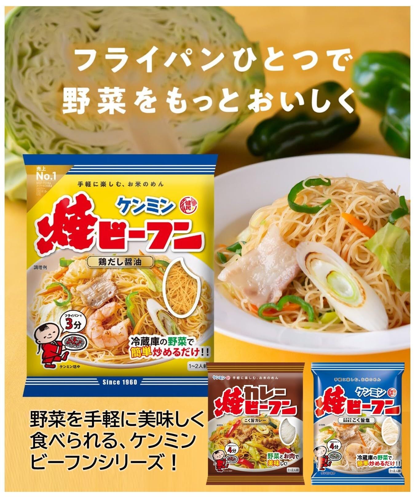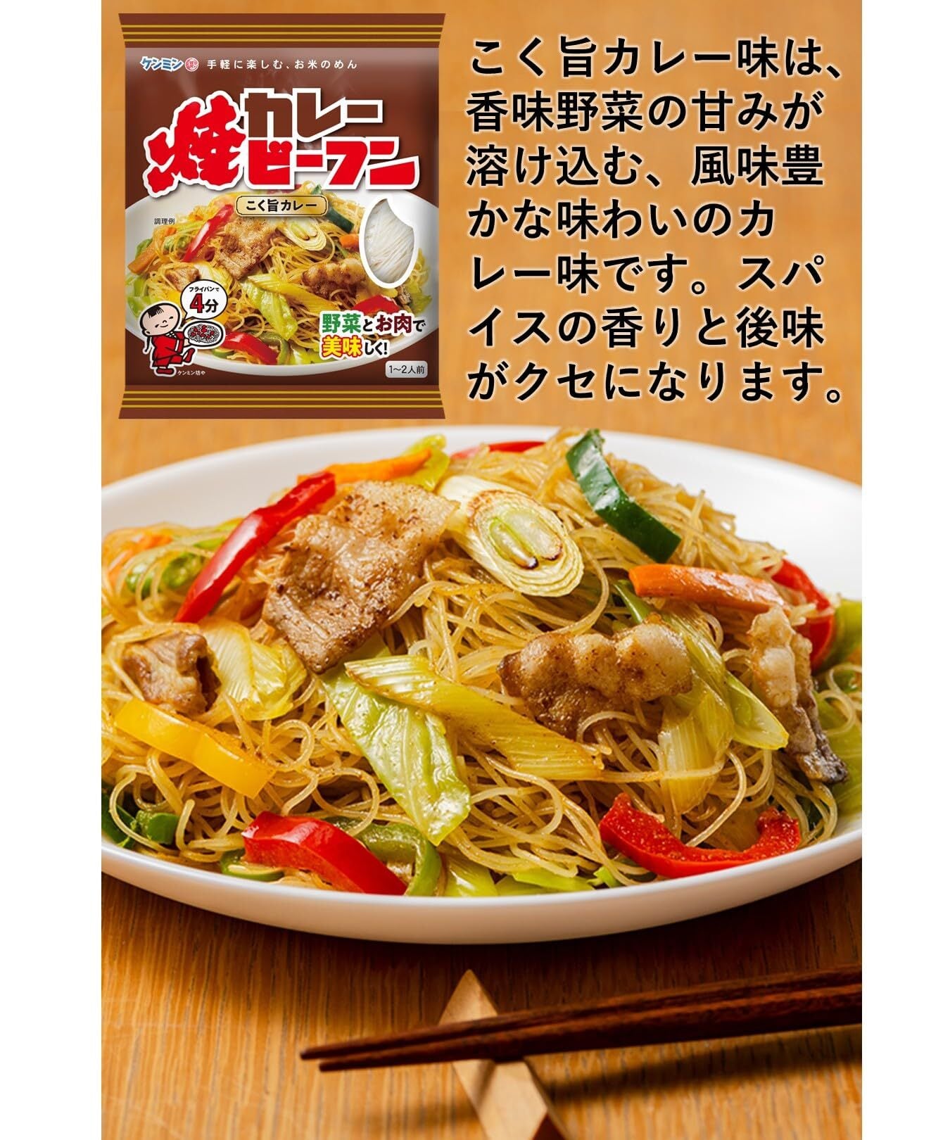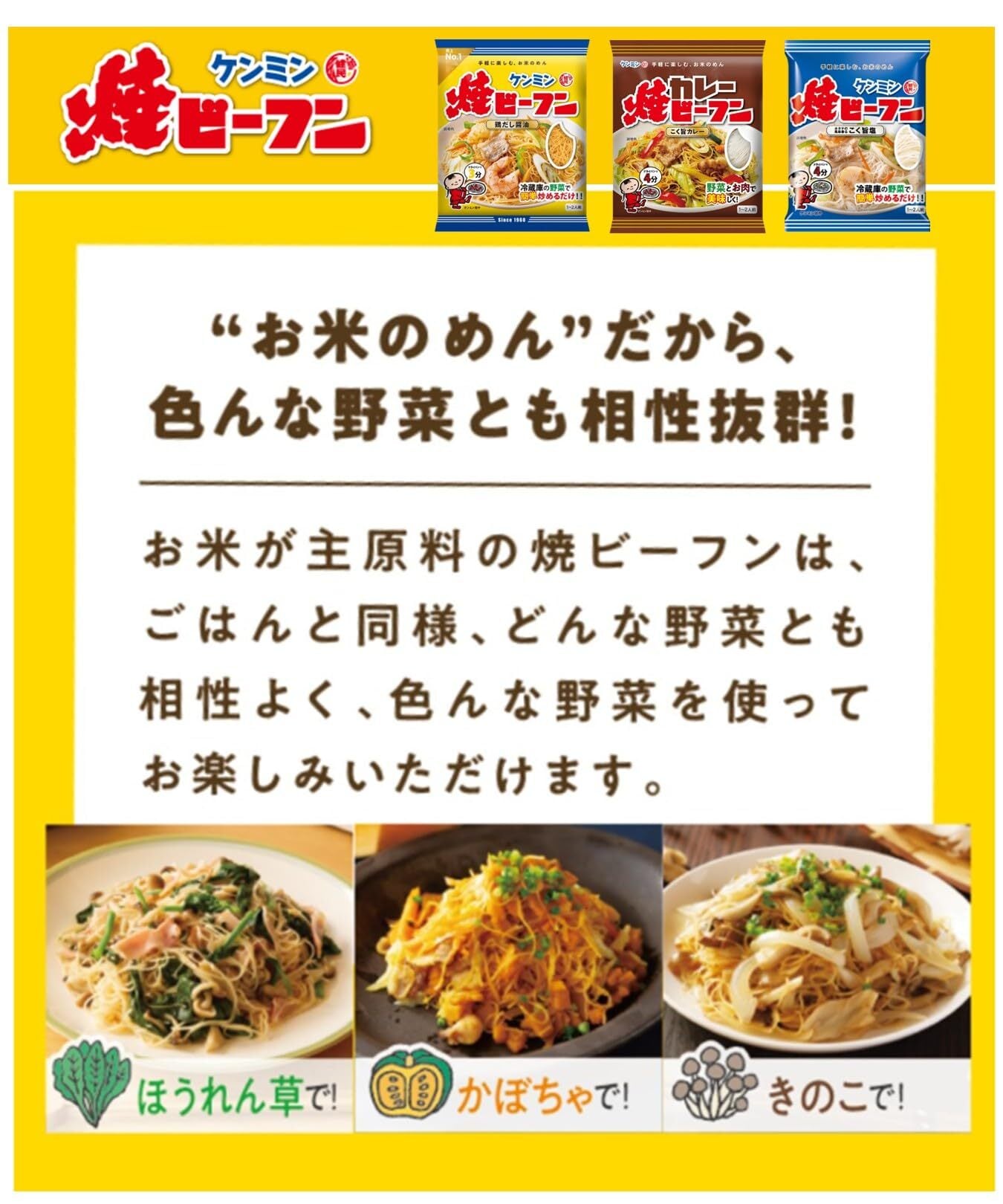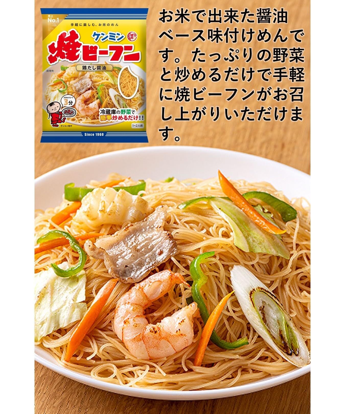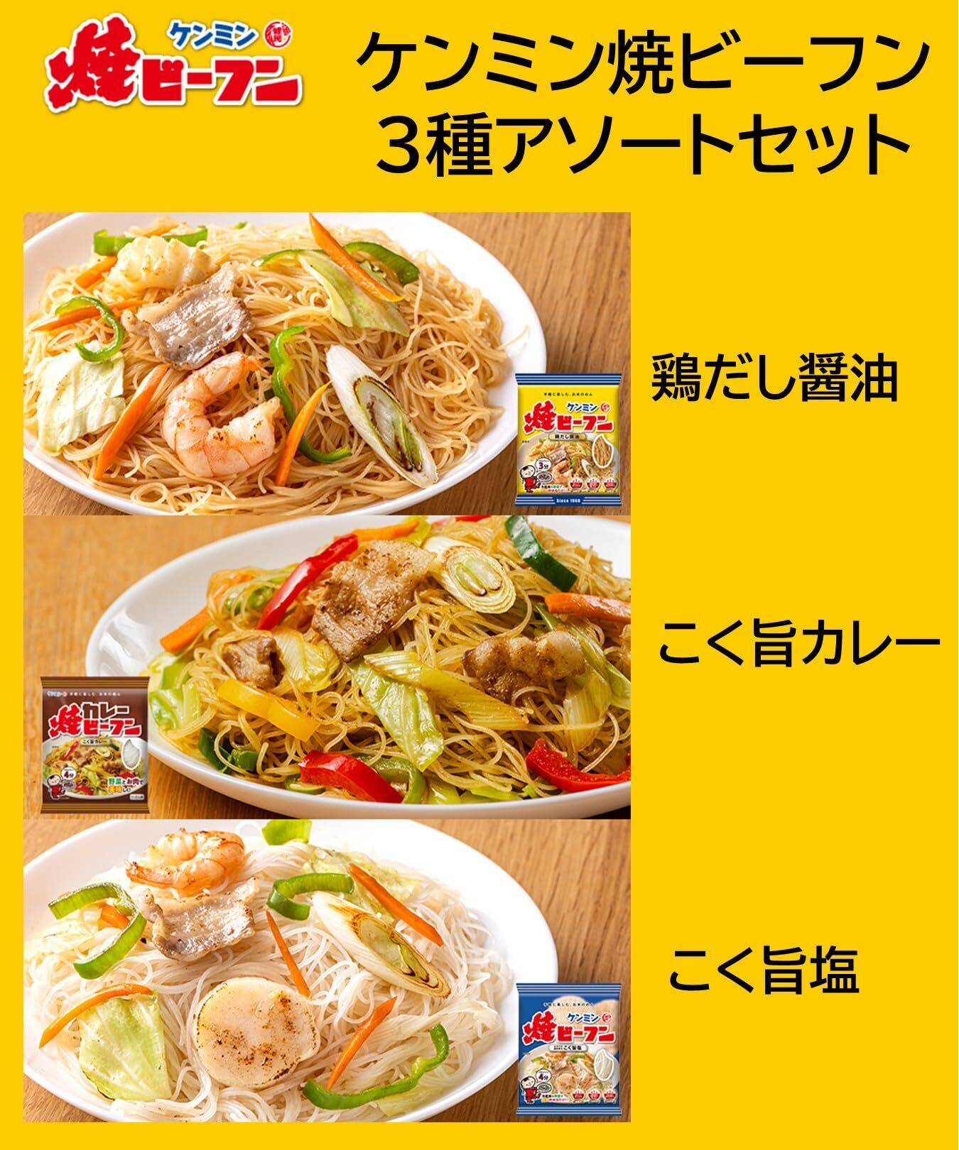ケンミンの3種類の焼きビーフンのお味を楽しめる3種アソートです。【鶏だし醤油】1960年生まれのロングセラー商品。味付タイプのビーフンなので、ゆで戻す手間がいりません。フライパンでも電子レンジでも簡単に調理できるノンフライめん。ダイエットにうれしい低GI食品です。 【こく旨塩】チキンベースに「豚脂のこく」と「ホタテの風味」を加え、アクセントに「生姜」や「ごま油」の風味をバランスよく効かせました。ホタテの風味香るこく旨塩で、野菜をもっと美味しく、飽きのこないやさしい塩味です。 【こく旨カレー】たっぷりの野菜を炒め、カレーパウダーとからめるだけでカレー味の焼ビーフンが召し上がりいただけます。こく旨カレー味は、香味野菜の甘みが溶け込む、風味豊かな味わいのカレー味です。