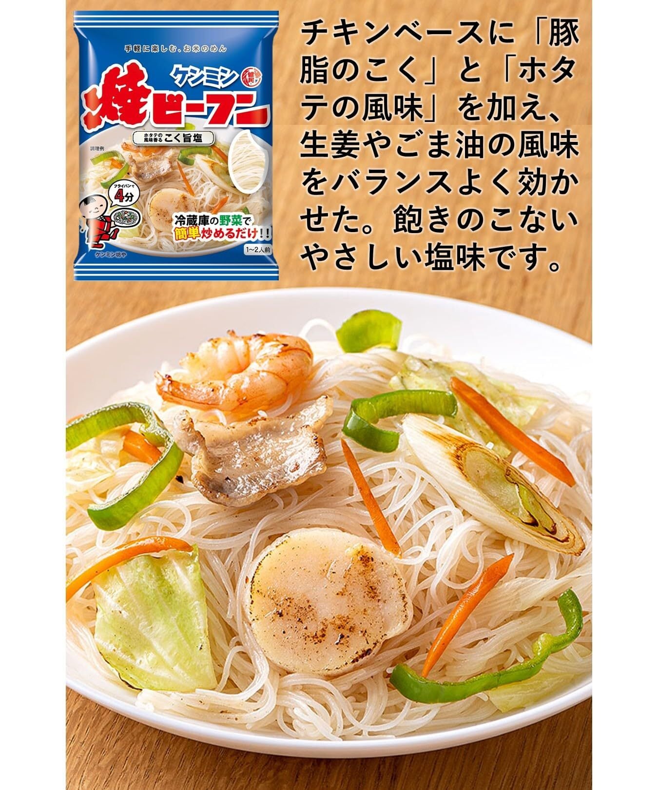 こく旨塩:ビーフン(米、でん粉/糊料(繊維素グリコール酸Na)、乳化剤、リン酸塩(Na))(タイ製造)、液体ソース(食塩、ホタテシーズニングオイル(植物油脂、調味油脂、ホタテ、しょうゆ、しょうが)、砂糖、動物油脂、おろししょうが、ポークエキス、清酒、チキンエキス、植物油脂、ガーリックパウダー、オニオンパウダー/調味料(アミノ酸等)、酒精、増粘剤(キタンサンガム)、酸化防止剤(ビタミンE)、香料)(一部にえび・小麦・ごま・大豆・鶏肉・豚肉を含む)