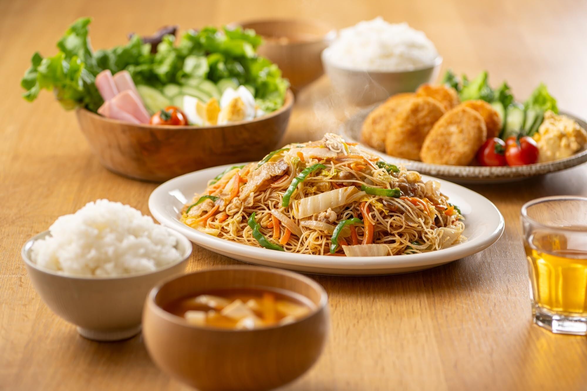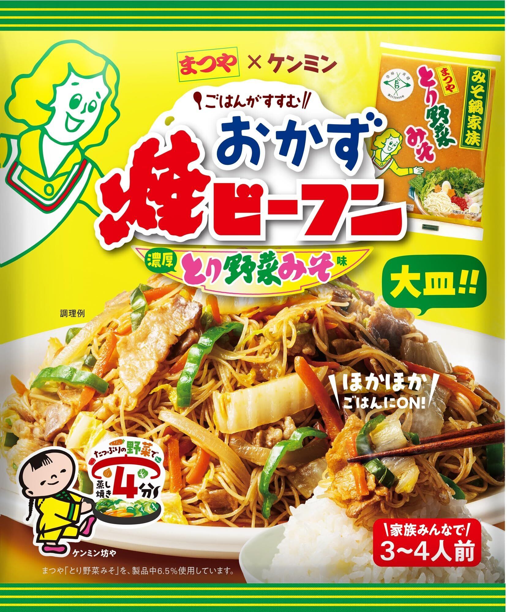 野菜がたっぷり手軽に美味しく食べられる大皿おかずの焼ビーフン。石川県のソウルフード、まつや「とり野菜みそ」とのコラボ商品。みその味わい深い風味とコクが特徴。